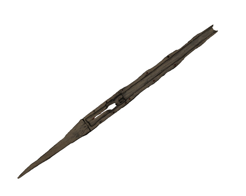 Square oak log with hemispherical recess. This has been the bed for the fire pipe. In the center, there is a hole, for possible fork mounting.