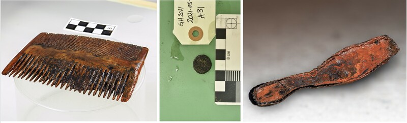 A well-preserved double-sided comb (find A32), presumably of boxwood, sat directly upon the flint ballast pebbles in the deepest excavation stratum. The find locus was the center of the southern half of the trench. From the same locus, a degraded silver coin (find A31) was recovered (see figure 12).