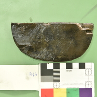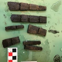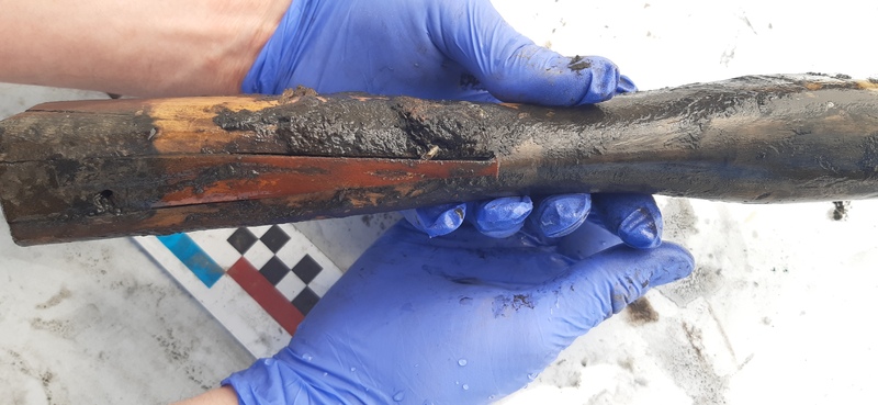 Crossbow accoutrements recovered in context with the weapons include a variety of quarrels intact except for their metal points, a possible wooden quiver and its bottom (A21 and A43), and two birch bark panels decorated with animal and floral motifs (A17 and A103). The birch bark panels might be coverings for the composite prods of crossbows. Composite prods were made from laminated sinew, horn, wood, sometimes baleen, adhered with glue, and wrapped with birch bark for moisture resistance. The best glues were made from sturgeon swim bladders; this provides additional context for the sturgeon in the cask recovered in 2019. Alternatively, the birch bark panels might be decorative elements of an undiscovered object such as a bolt box; see for instance the “Box For Crossbow Bolts (Bolzenkasten), Probably Made for William IV, Duke of Bavaria (r. 1508–50)” Metropolitan Museum of Art Accession Number: 69.199.