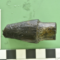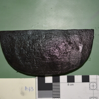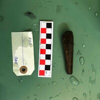 In the northeastern portion of the trench, at the locus of crossbow, portions of a “bollock dagger” were recovered. These include the weapon’s distinctive shaft and spherical protuberances (A144) and a patterned metal end cap of the handle (A152).