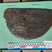 In the northwest corner of the trench, a stave-built wooden pail (finds A239A-Q) appeared in the wall of the trench during the removal of sediment to reveal crossbow find A238 (see figure 10 and figure 11). The artifact was approximately 30 cm below the sediment surface. The pail’s hoop had disintegrated and therefore its staves were falling into the trench. The decision was made to recover the staves and bottom of this container. This was accomplished, with the exception of one or two staves at the back side of the pail. Retrieval of those final components must await excavation from the top of the locus, as this was beyond the scope of the 2021 operation.