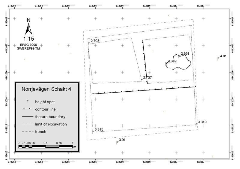 In Trench 4, the moraine never appeared and the trench ended up 1,5-2 m deep consisting of mixed layers. The southern profile in the trench revealed obvious ruptures in the stratigraphy (see Model) and at the bottom of the trench a stone packing appeared that either was considered to form a part of a natural beach ridge or possibly belong to a constructed stone packing (see figure)