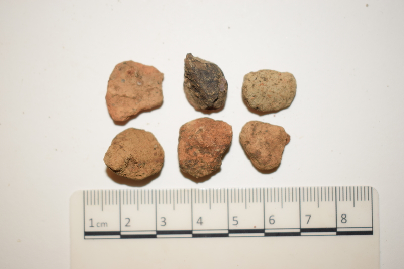 Som presenterats ovan, påträffades en hel del brända ting i rutan, mest koncentrerat i rutans västra sidan, men även spritt över hela enheten. Exempel på detta är träkol, skörbränd sten, bränd flinta och bränd lera (F635) med rödaktig färg (6 bitar med en vikt på 25 gram), men även fragment av keramik (F633) med gulaktig färg (11 bitar med en vikt på 10 gram). De brända föremålen tog störst plats högre upp i sticket och avtog mer och mer ju längre ner i sticket vi kom.