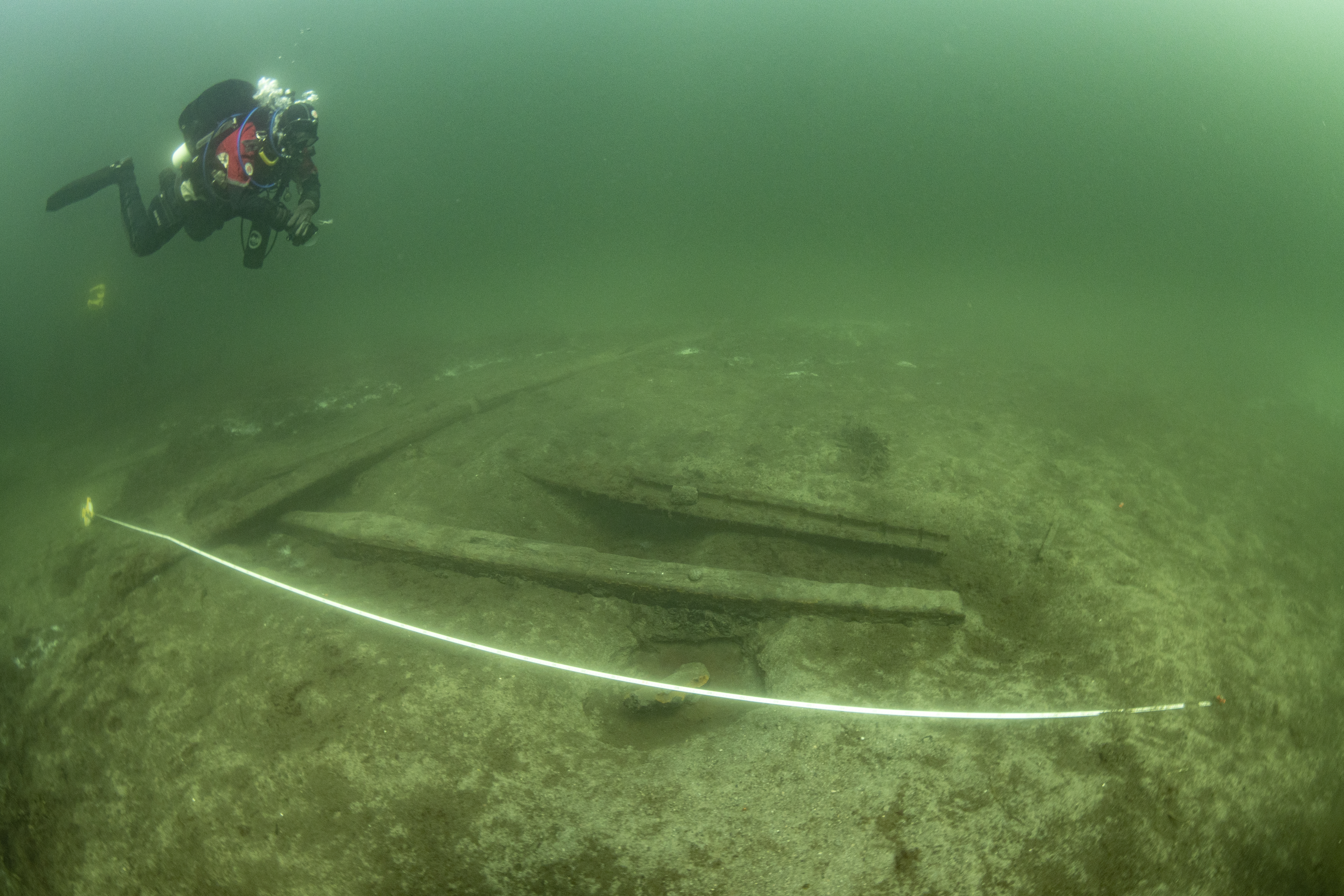 Large gun carriage upside-down with wrought iron gun and two breech chambers intact. Smaller gun carriage placed alongside for scale, prior to recovery. Image: Klas Malmberg.